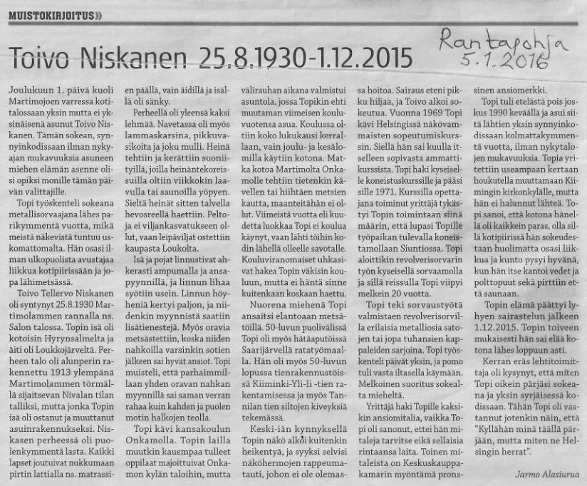 Rantapohja 6.1.2016 – Toivo Niskasen muistokirjoitus